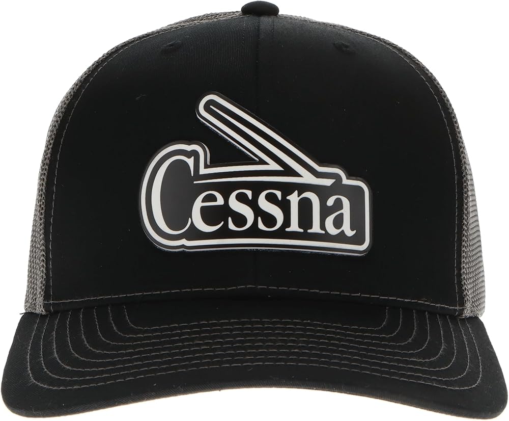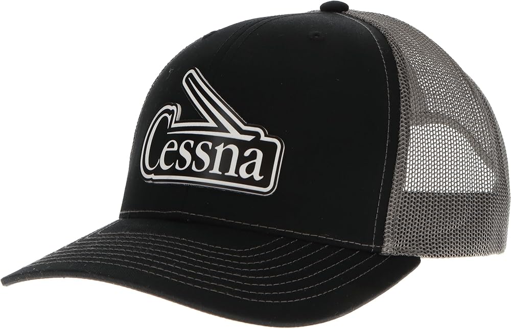 Celebrate the golden age of general aviation with the Cessna 50's & 60's Logo Velocity Trucker Hat in Black/White from Aeroplane Apparel Company, featuring a crisp black-and-white acrylic patch of the classic mid-century Cessna logo on a six-panel, mid-profile trucker cap. Built for all-day comfort and timeless style, it pairs a durable cotton-poly twill front with a breathable mesh back, a pre-curved bill, and a standard cotton sweatband, while the adjustable snapback ensures a perfect fit for most sizes. Cessna emblems, logos, and body designs are trademarks of Textron Innovations Inc. and are used under license by PilotMall.com Inc.