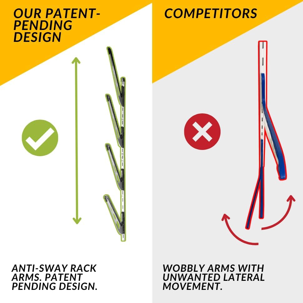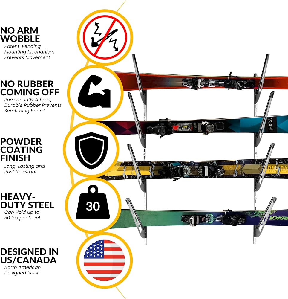 Ski Storage Rack for Garage | 4-Tier Horizontal Ski Rack and Indoor Garage Organizer | Anti-Sway Patent-Pending Arm Wall Mount | USA Designed