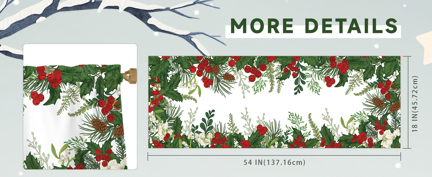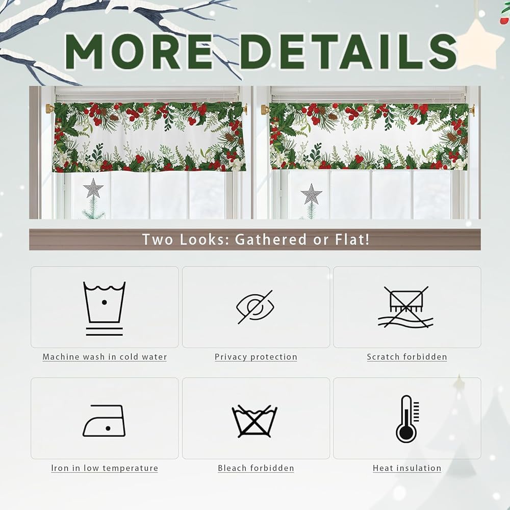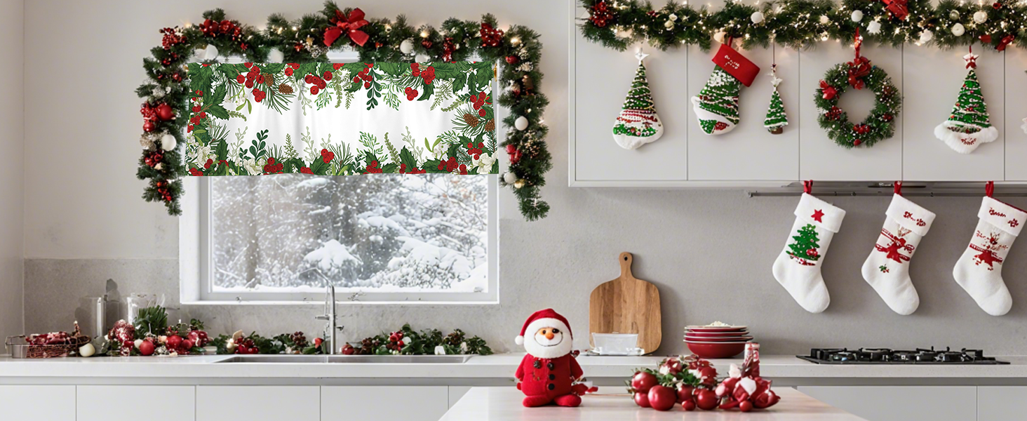【Theme Design】The Christmas Curtain Valance showcases a design with a border of lush green leaves, vibrant red berries, and delicate white flowers, creating a fresh and festive Christmas atmosphere.