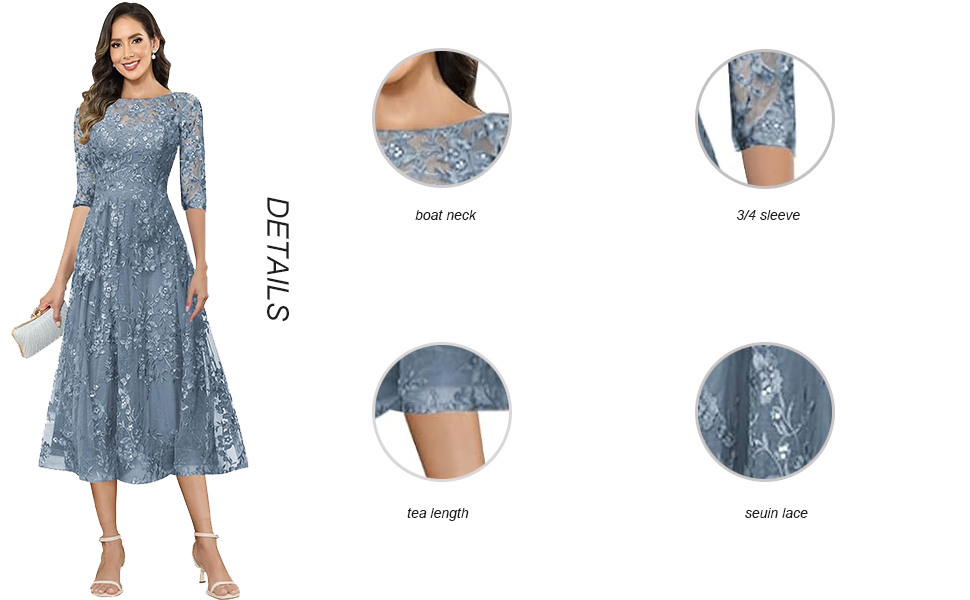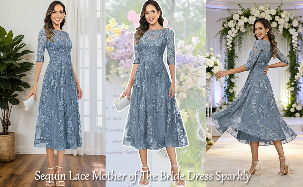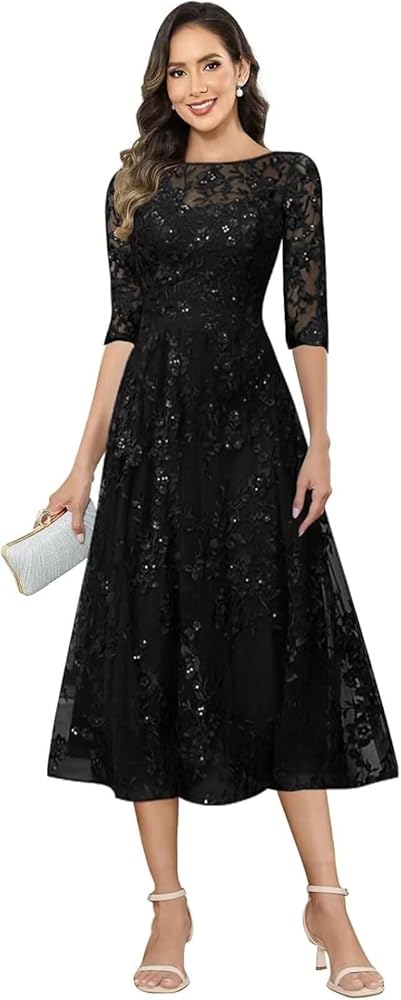 Sequin Lace 3/4 Sleeve Mother of The Bride Dresses Tea Length Wedding Guest Dress for Women Boat Neck Grandmother of The Groom Dress Tulle Sparkly Formal Cocktail Dress Floral Applique Prom Party Dress