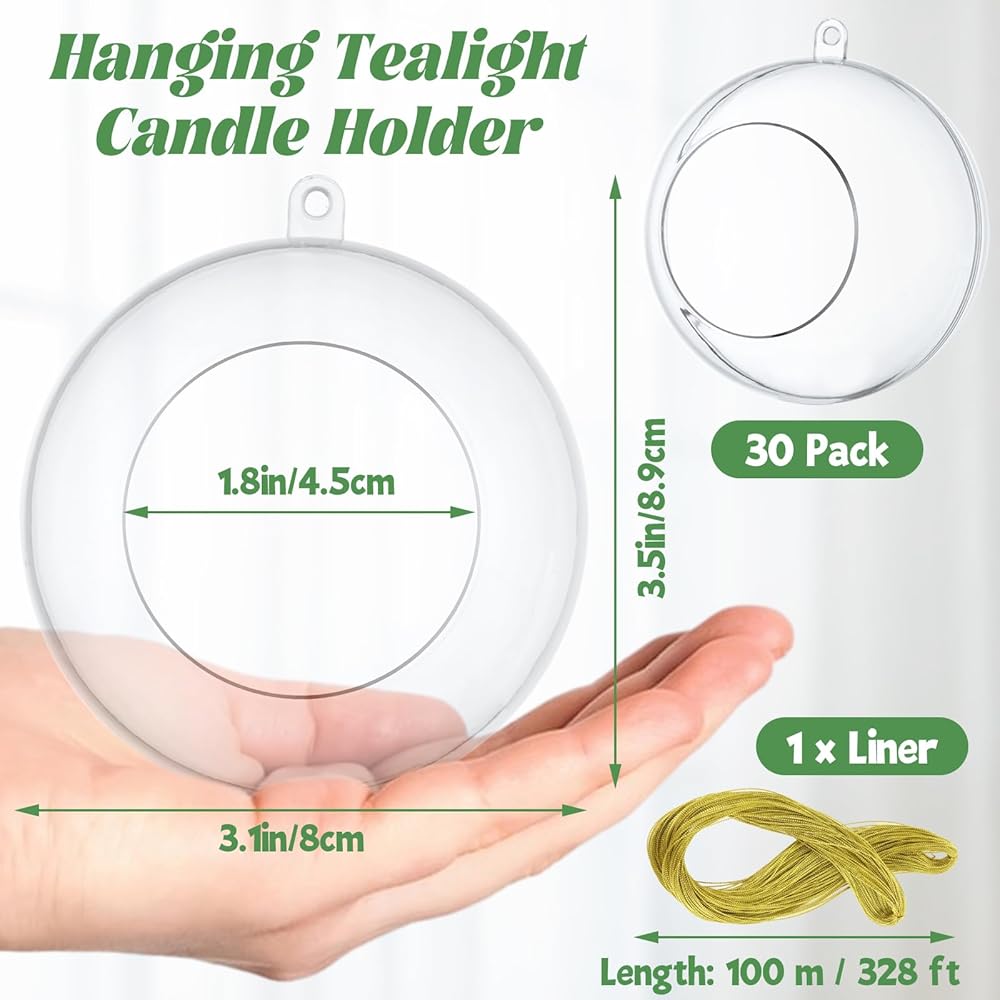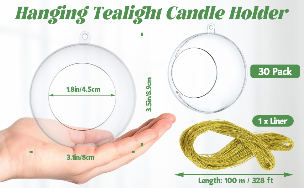 PACKAGE INCLUDE: Each package includes 30 pack acrylic hanging tealight candle holders and a roll of 100 m / 328 ft decorative ropes. The diameter of tea light holder ball is 8 cm / 3.15 inch, opening diameter is 4.5 cm / 1.8 inch and the height is 8.9 cm / 3.5 inch. NOTE: Tea candle cups CANNOT be placed flat on the table