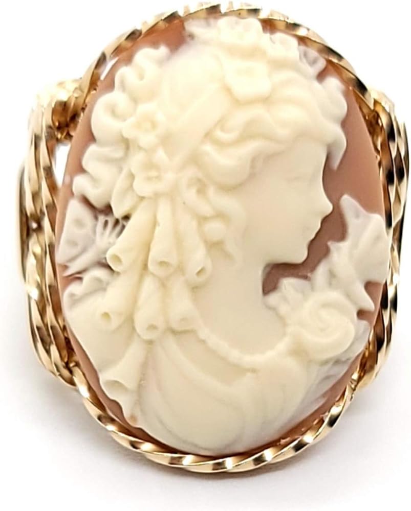 Beautiful Grecian Goddess with Butterflies Large Fashion Molded Resin Cameo hand sculpted in the finest Jeweler's 14k Gold Filled in Artistic Designed Setting. Grecian Goddess with Butterflies blending into a Coffee background. Please choose ring size at time of purchase.