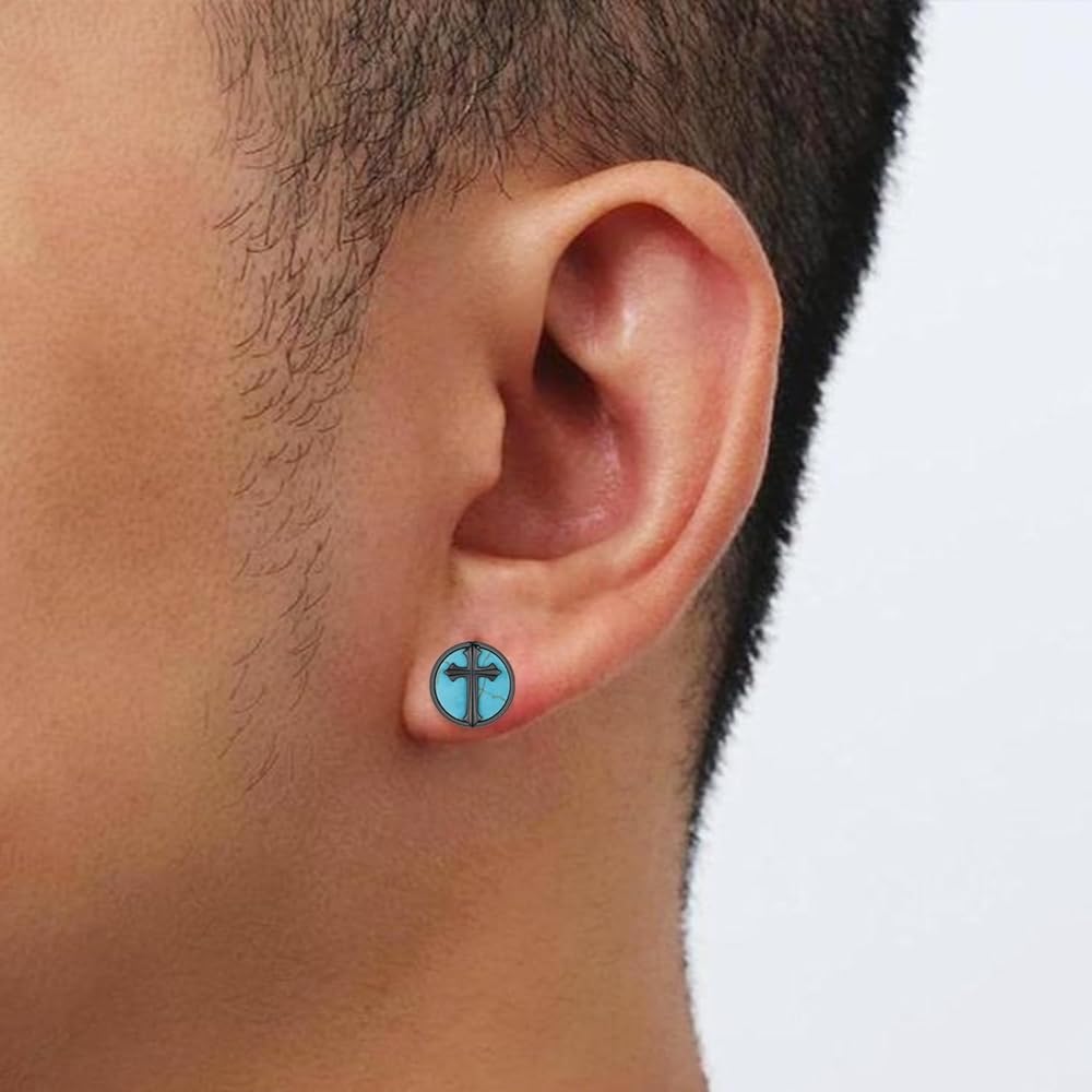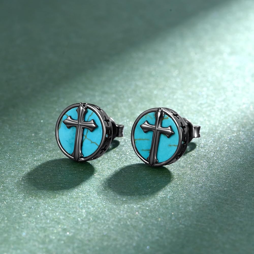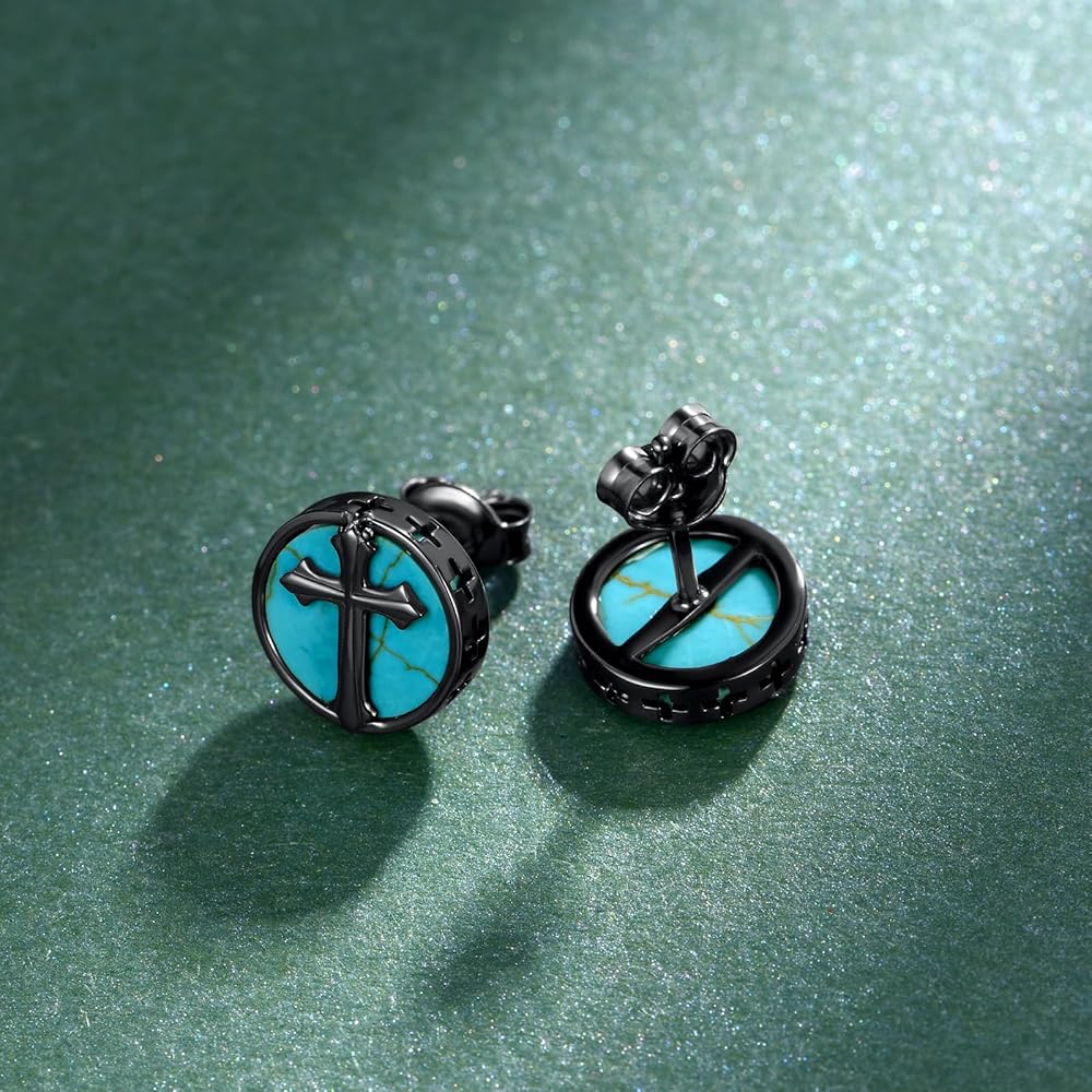 Genuine Turquoise Cross Earrings for Men: These bold cross earrings feature authentic turquoise stones paired with a deep black finish, symbolizing strength, protection, and faith. Inspired by vintage Western style, these genuine turquoise earrings make a statement of rugged spirituality and masculine elegance.