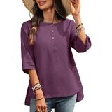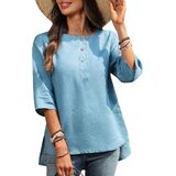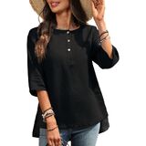 • Flattering Henley Design with 3/4 Sleeves: A timeless women's blouse featuring a round neckline with button detail, 3/4 length sleeve womens tops styling, and side slits for comfort and movement. A go-to piece in womens tops summer collections