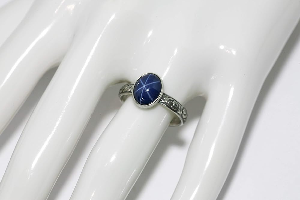 This ring features a bezel mounted lab created Star Sapphire, on a 3.5mm wide 925 Sterling Silver Vine pattern band. Oxidized to a Vintage Silver Finish. Ring sizer included. Shipped in gift box.
