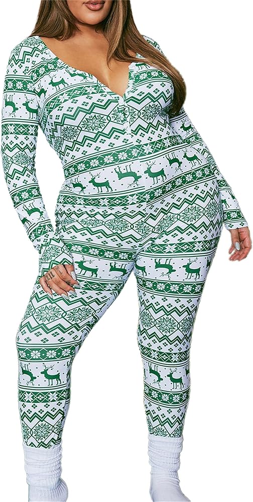 Feature: Adult onepiece pajamas,Christmas pajama jumpsuits for women; Long sleeve v neck button up pattern print romper sleepwear; One piece pjs with cute christmas printed, Fashionable and classic