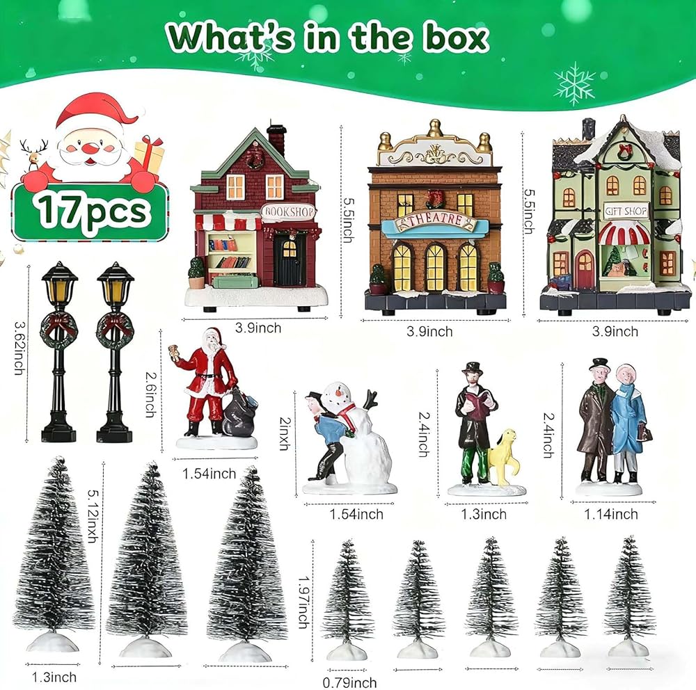 Christmas Village House Set: receive 3 LED decorative house ornaments, 8 Christmas tree ornaments, 1 snowman ornaments, 1 Santa Claus ornament, 1 Couple , 1 Dog lover,2 street light ornament, 17 pieces in total