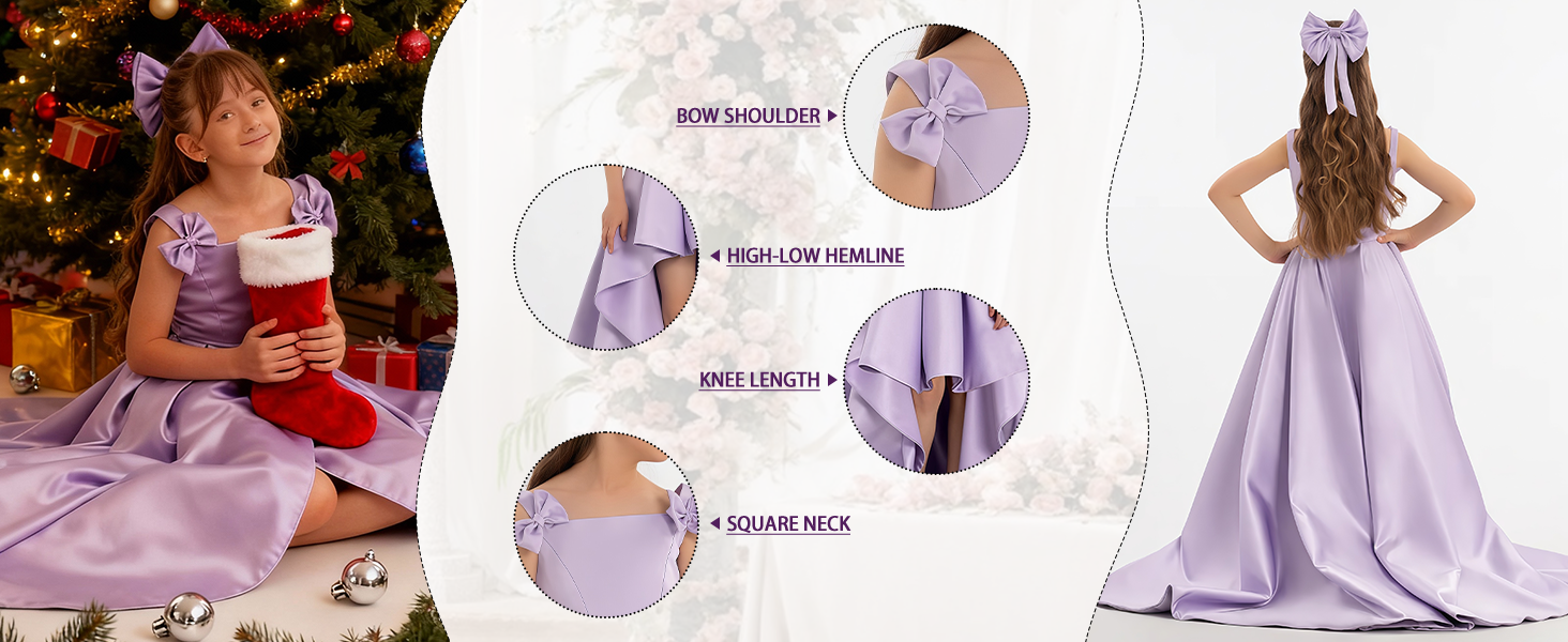 Sweet Bow Accents:Adorned with double shoulder bows and a matching hair bow, this lilac dress adds a lovely touch of charm. The elegant details make your little one look like a true princess