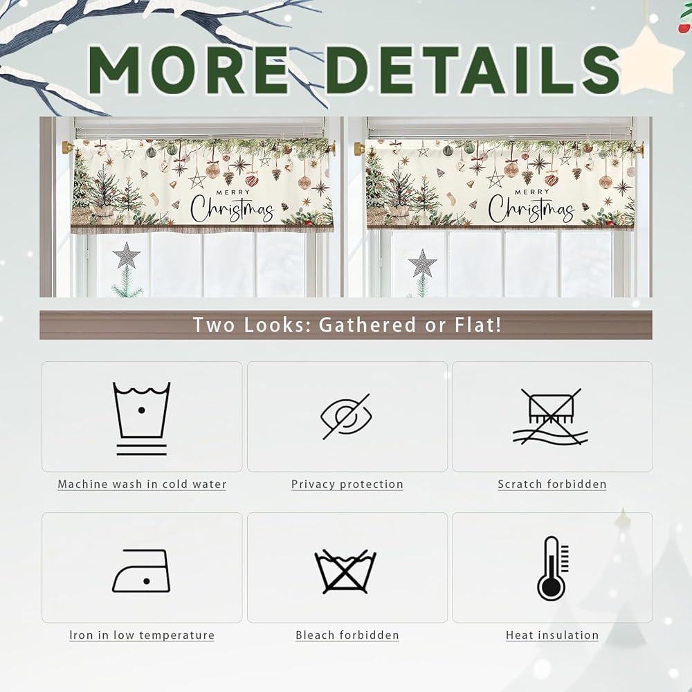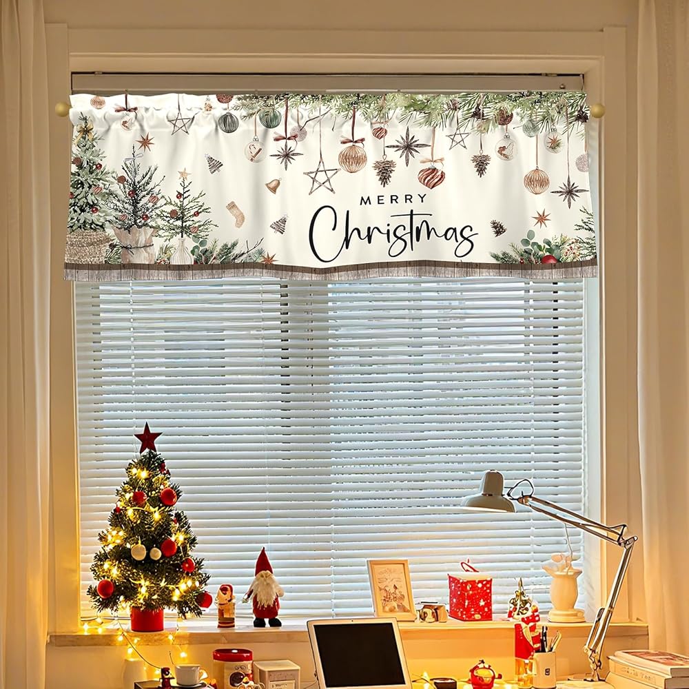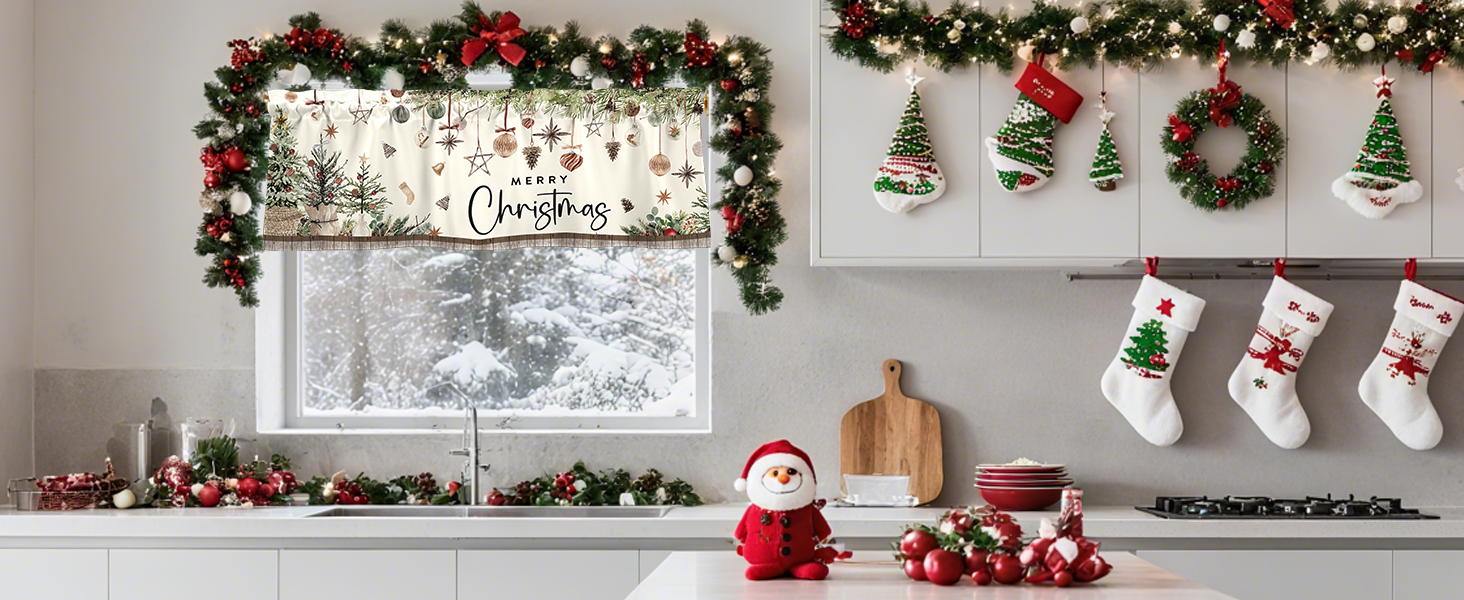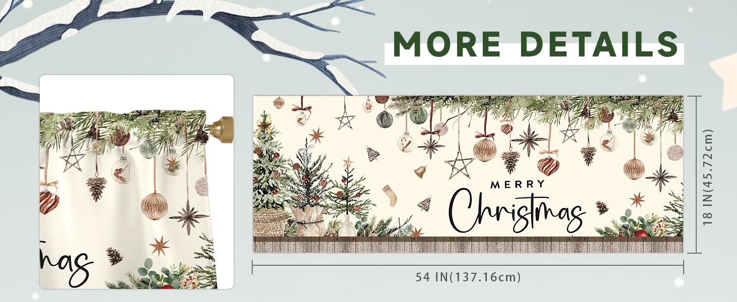 【Theme Design】The Christmas Curtain Valance features a light - colored background adorned with hanging Christmas ornaments like baubles, stars, and pinecones, along with Christmas trees and the "MERRY Christmas" lettering, creating a warm and festive Christmas atmosphere.
