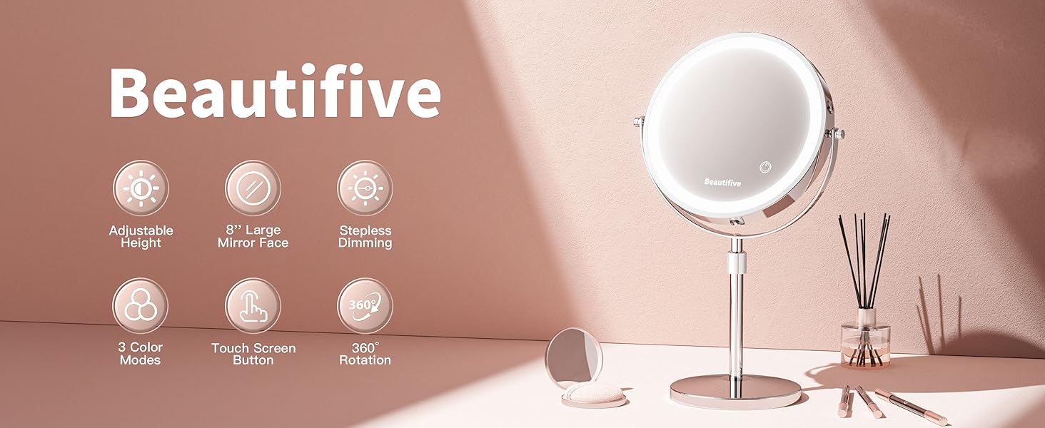 Large-Range Height Adjustable LED Makeup Mirror: This tabletop makeup mirror offers an adjustable height range from 15 to 19 inches(36cm-48cm), making it versatile for various desk and countertop heights. With 360° rotation, the mirror can be easily adjusted to achieve the perfect angle, ensuring precise and comfortable makeup application from any position.