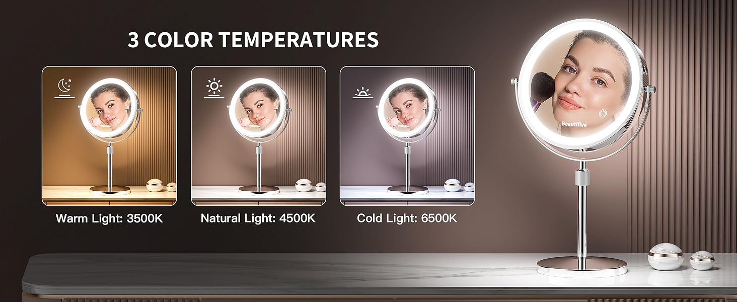 3 Lighting Modes and Stepless Dimming: Equipped with 72 high-brightness LED bulbs, this magnifying makeup mirror provides three lighting modes: cool light, warm light, and natural light. Simply touch the button to switch between them. Additionally, you can adjust the brightness steplessly to suit any environment. (Note: During use, long press the button to adjust to your most suitable brightness.)
