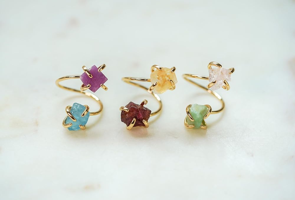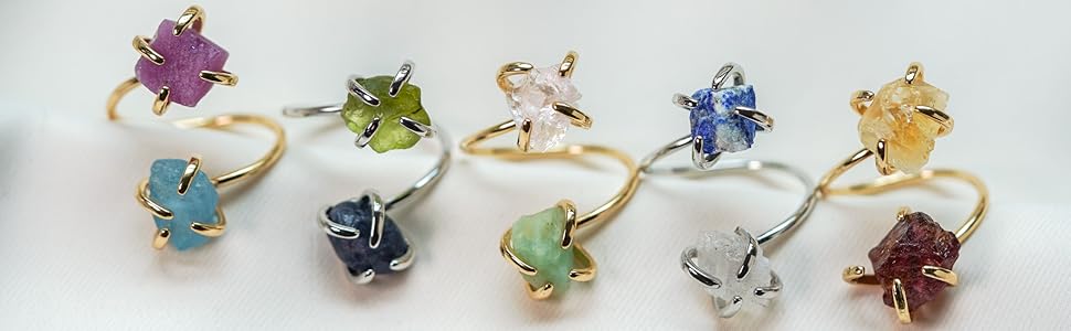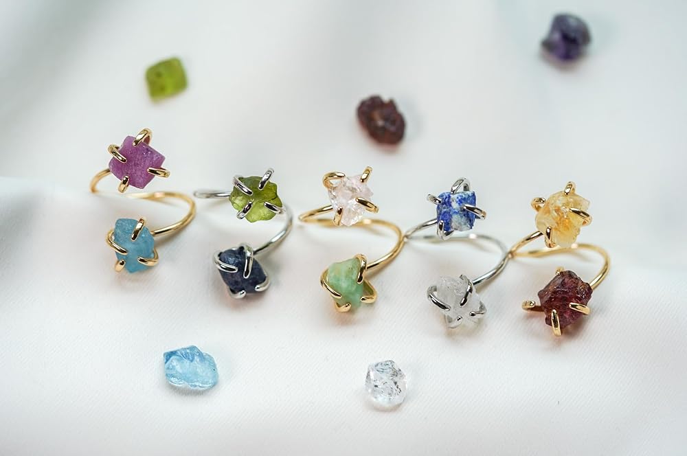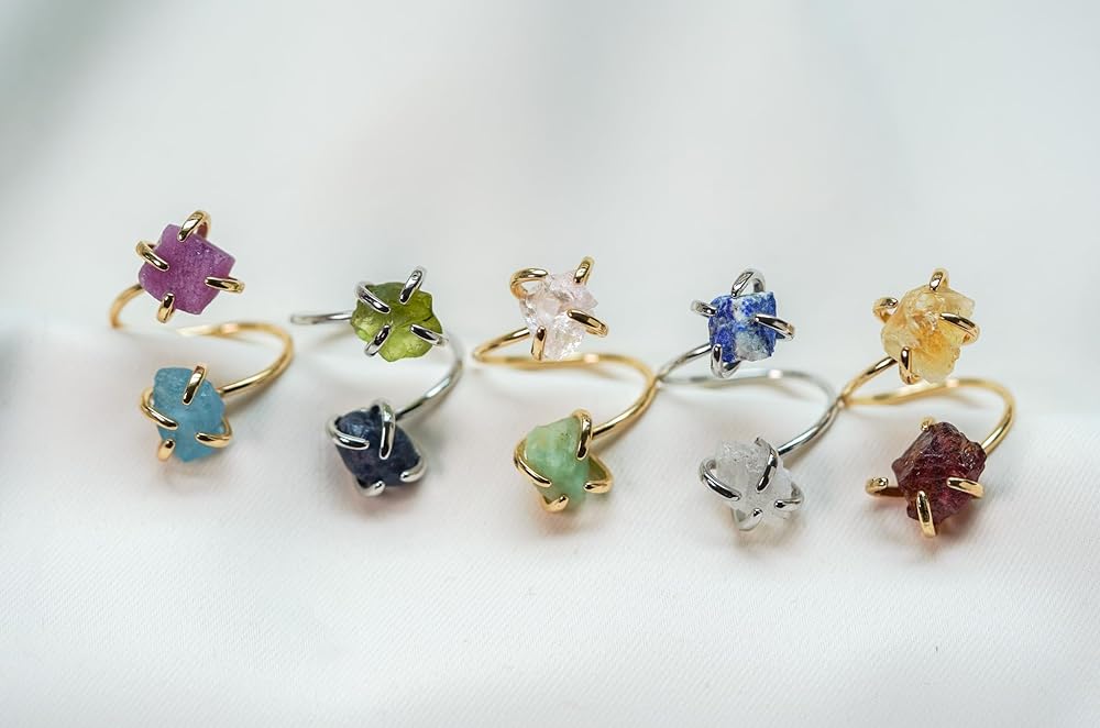Raw Gemstones: The gemstones used in these rings are raw and unpolished. They are natural and untreated, which means that each gemstone has its own unique characteristics and beauty, and each stone varies in color, shape, and size. You can choose from a variety of gemstones, including birthstones.