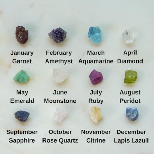Birth Months & Gemstones: January - Garnet; February - Amethyst; March - Aquamarine; April - Diamond; May - Emerald; June - Moonstone; July - Ruby; August - Peridot; September - Sapphire; October - Rose Quartz; November - Citrine; December - Lapis Lazuli