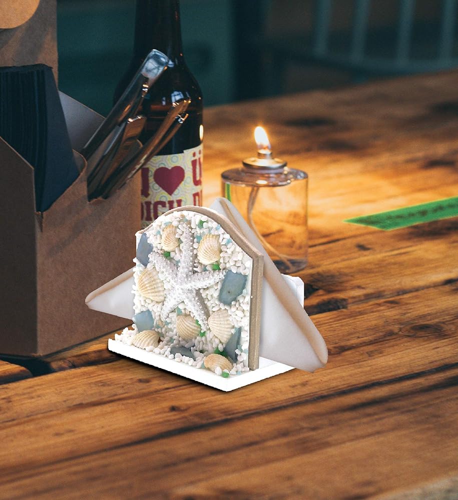 INCLUDED IN THE PURCHASE OF WOODEN NAPKIN HOLDER FOR KITCHEN - Includes 1 CoTa Global Oceanic Napkin Holder that features a starfish design with seashells and stones and comes with rustic accents and distressed texture. Adorned with intricate details and colored in white color. Fits perfectly any collection of nautical theme accessories. The decorative napkin holder measures 4.5Lx4.9Wx3.25H and fits perfectly as nautical table top beach decor.