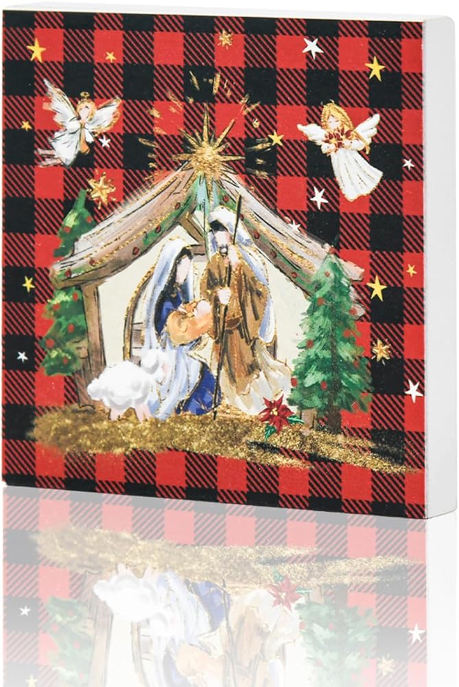 Smile Christmas Indoor Decoration, Red and Black Checkered Christian Jesus Square Christmas Wooden Sign for Desk Table Shelf Office Farm Kitchen Decor 5 x 5 Inches.