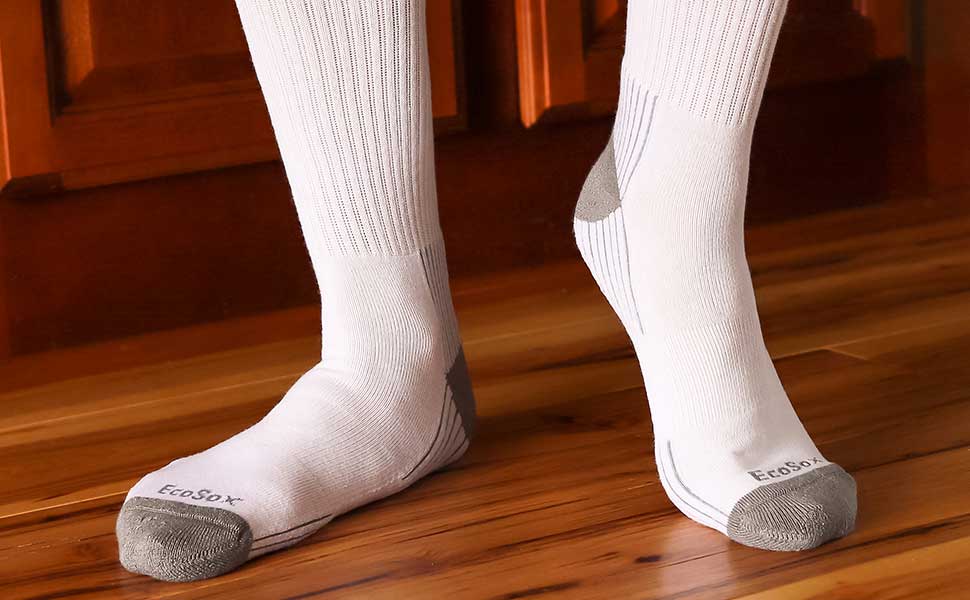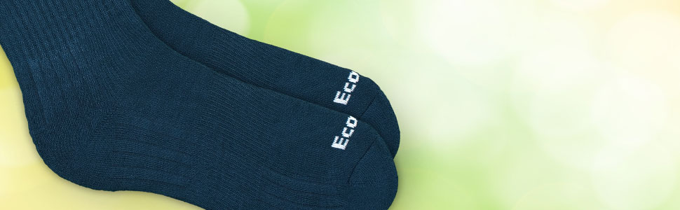 EcoSox Crews are High Performance Sox Woven from Viscose Derived from Bamboo Fibers. Exclusive construction provides comfort in a wide range of conditions.. The moisture management and breathability of these fibers remove sweat and moisture away from the skin where it can evaporate to help keep your skin dry and clean and breathe to regulate temperature. Odor-causing germs can not grow without moisture, and the evaporation process helps keep your skin cooler in the summer and warmer in the winter. The next to skin smoothness reduces friction and helps prevent blisters from the sock.