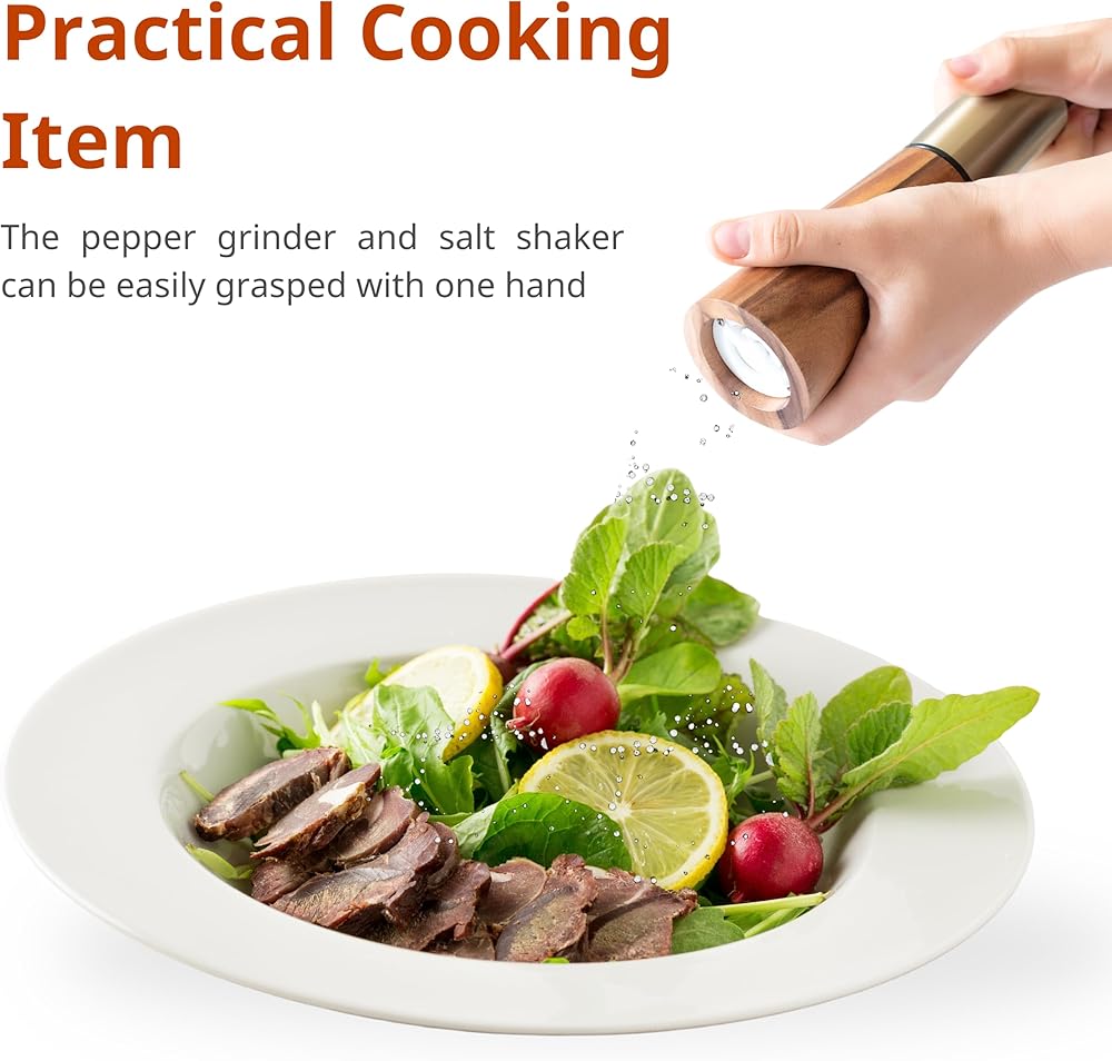 Modern and elegant design: The 7.28-inch pepper grinder and salt shaker can be easily grasped with one hand. Open the top cover and easily add sea salt and pepper to the grinder. The sandy gold color is not exaggerated, gorgeous and low-key luxury. The pepper grinder set looks beautiful and attractive. It is an ideal gift for kitchen and barbecue lovers.