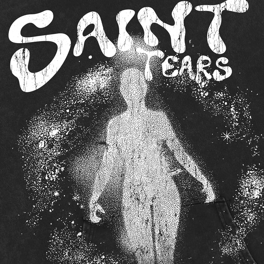 Unique Design:Features a striking "Saint Tears" graphic on the front, with a shimmering silhouette and cosmic-inspired details. This bold design captures attention and adds a touch of artistic individuality to your wardrobe.