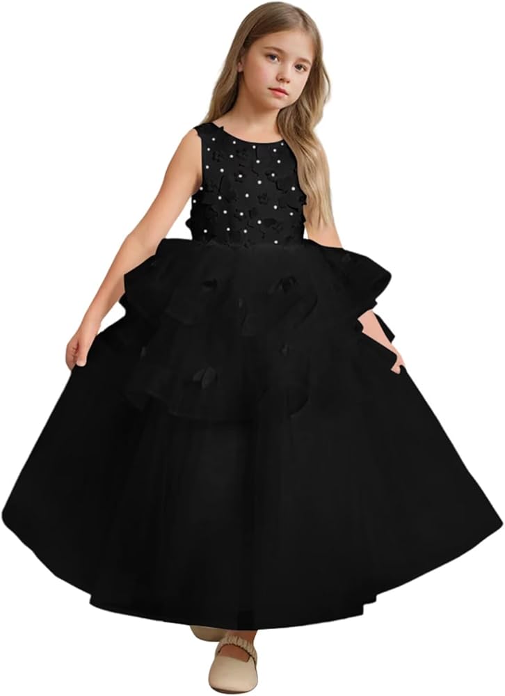 Features: This flower girl dress is made of tulle and satin. The upper body is decorated with 3D butterflies and white pearls. The lower body adopts a layered design, making it an elegant princess party and children's beauty pageant dress