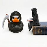 This duck isn't here to quack around. Dressed like Death with a scythe and signature scowl, he's ready to ride shotgun on your dashboard or haunt your office desk. Whether you're ducking Jeeps, decorating for Halloween, or stirring up chaos at your holiday gift exchange, this little guy delivers.