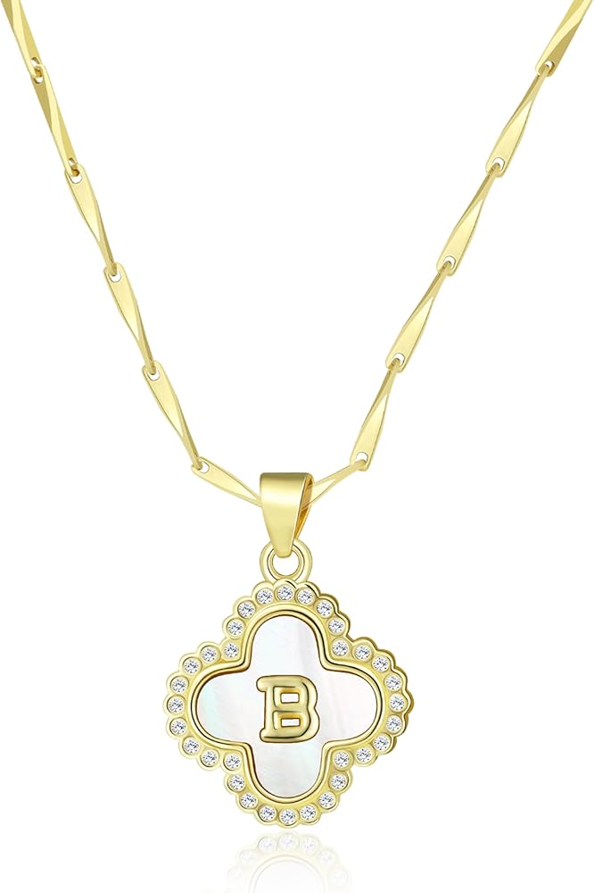ORIGINAL DESIGN: A symbol of luck and identity — this four-leaf clover pendant features a personalized initial at the center, set on a natural seashell base with zircon accents. A minimalist statement, perfect for solo wear or layering