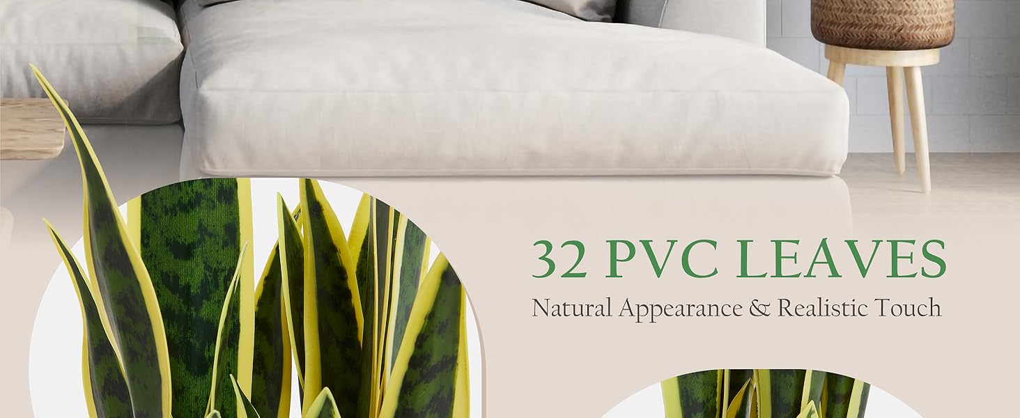 About Detail - Height: 2.15 Feet (25.6 in.). Our realistic snake plants are made up of 32 PVC leaves with realistic textures and lifelike colours, while reflecting a noticeable shine and vibrancy for a lifelike appearance that will never fade. The non-decorative black pot is made of PP, with cement poured inside which ensures the overall stability
