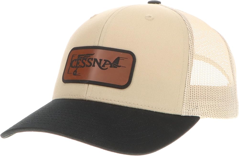 Celebrate the origins of general aviation with the Cessna 20's Logo Heritage Trucker Hat from Aeroplane Apparel Company, featuring a crisp, black-engraved patch of the historic 1920s Cessna logo on a timeless buckskin-colored leatherette for authentic vintage appeal. Built on the iconic trucker cap silhouette, it pairs a durable cotton-poly twill front with a breathable mesh back for all-day comfort, and includes a classic six-panel, mid-profile shape, pre-curved bill, standard cotton sweatband, and an adjustable snapback for a universally comfortable fit. Cessna emblems, logos, and body designs are trademarks of Textron Innovations Inc. and are used under license by PilotMall.com Inc.