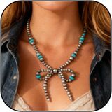 This Navajo pearl necklace for women blends boho turquoise beaded charm with a long layered choker design crafted for expressive Western inspired styling. The combination of beaded accents and a delicate bow pendant creates a distinctive piece that stands out while staying lightweight and comfortable for everyday wear. Designed to complement country concert outfits and cowgirl accessories, this necklace adds the perfect finishing touch whether you're dressing up for a festival, casual day out or special occasion. Its vintage influenced details bring a timeless appeal, making it an excellent choice for trendy gifts and stylish jewelry lovers who appreciate unique boho flair.