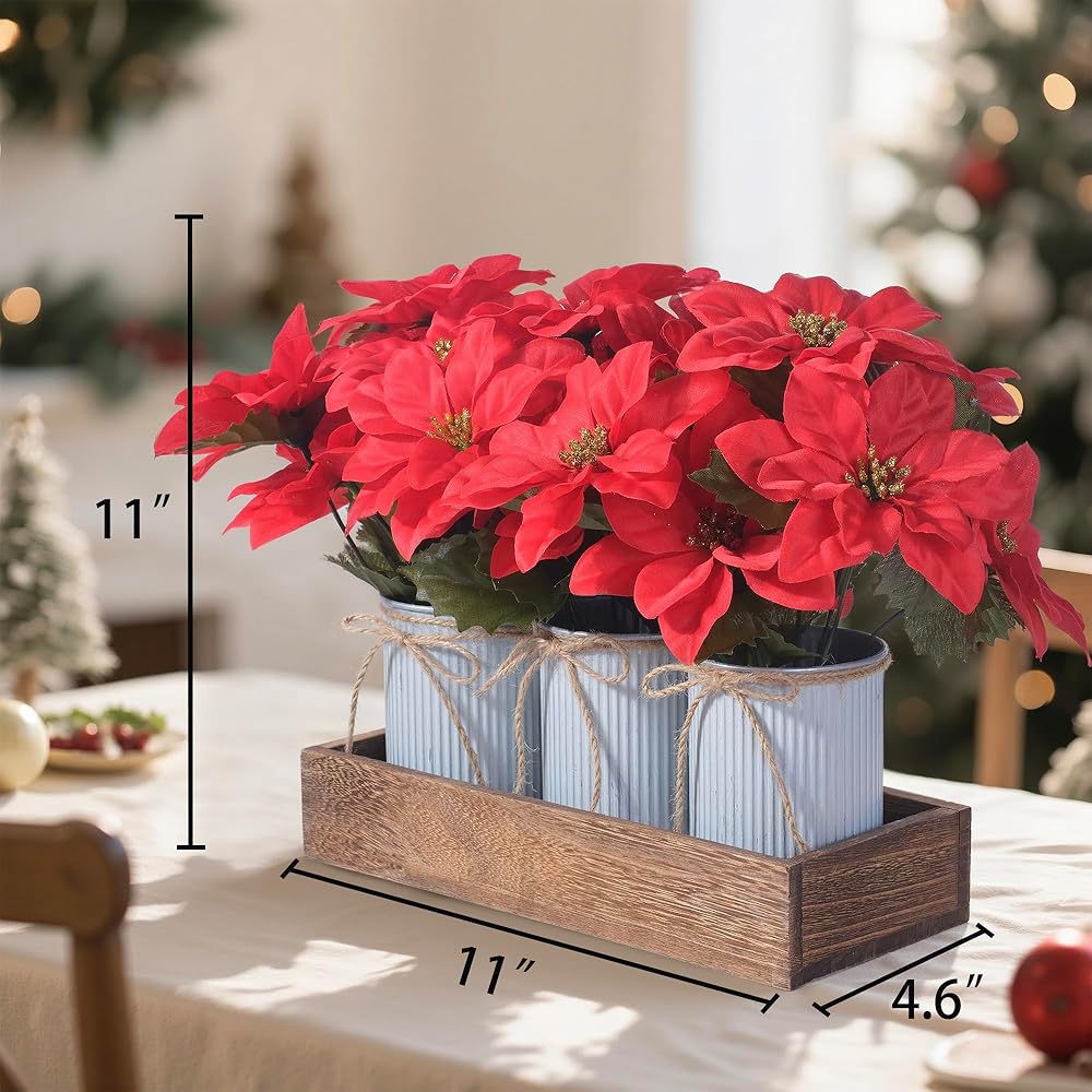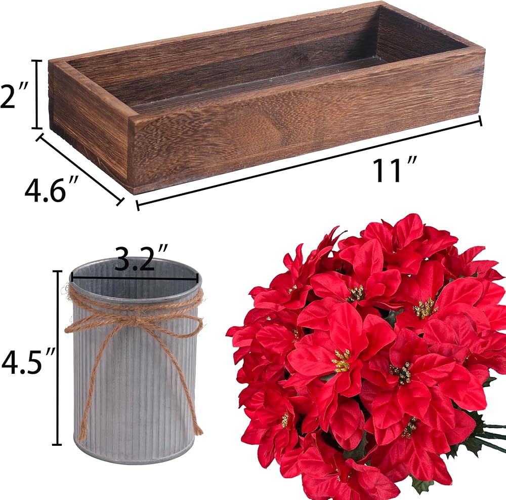 Package & Size: Set includes 1 × wooden box, 3 × galvanized metal pots with jute rope bows, and 3 × artificial red poinsettia flower arrangements (each with 7 flower heads). Wooden box measures 11" L × 4.6" W × 2" H, pots are 4.5" H × 3.3" W. Overall finished size: approx. 11" L × 6" W × 11" H.