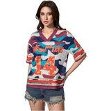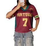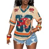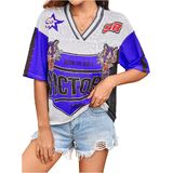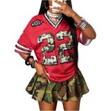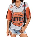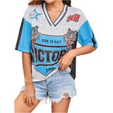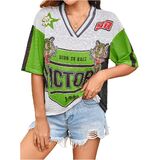 Features: Jersey shirt women, number print, colorblock, graphic, letter, mesh, short sleeve, v neck,