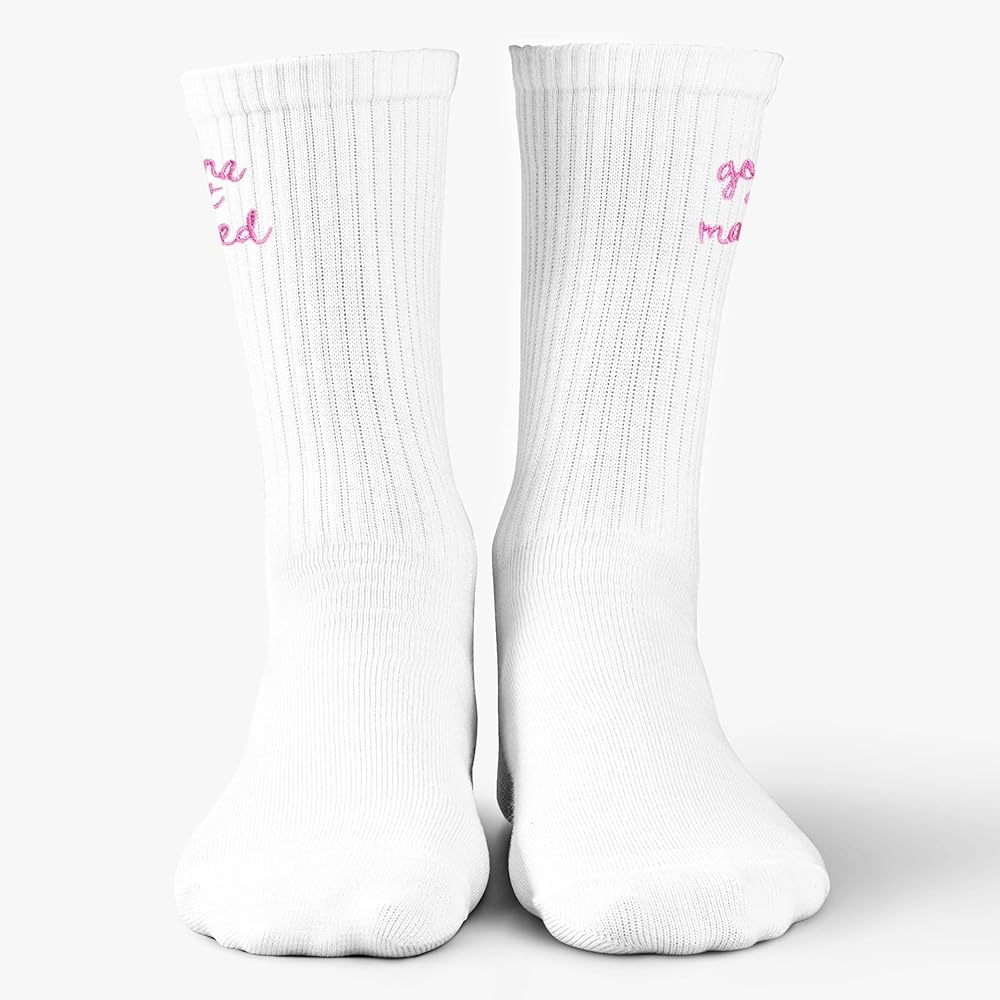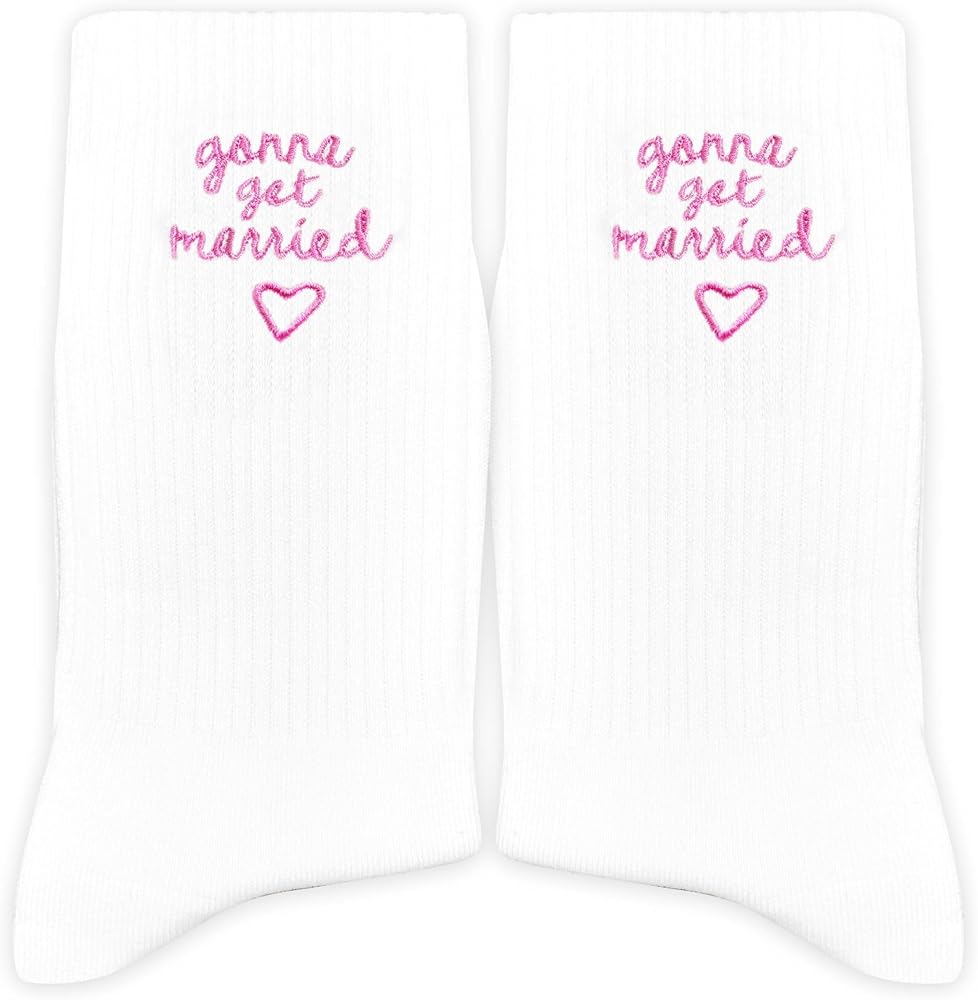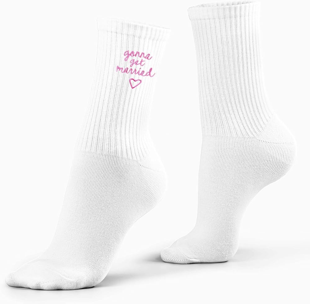 These bride socks feature a lovely embroidered message, “gonna get married” with a heart in soft pink stitching. Perfect for weddings, bridal showers, or bachelorette parties, they make a sweet keepsake for any bride to be. Crafted for both style and comfort, these socks bring a joyful touch to engagement celebrations and wedding mornings.