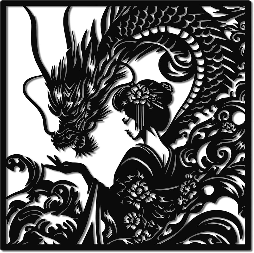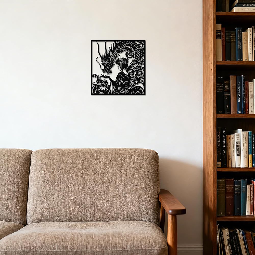 Every detail—from the dragon's layered scales to the geisha's ornate kimono embroidery and floral hairpiece—is laser-cut with precision, preserving the intricate charm of traditional Japanese art. Crafted from durable metal with a sleek black finish, this decor complements Japanese-style living rooms, tranquil bedrooms, or intimate tearooms, adding a touch of cultural depth to any space.