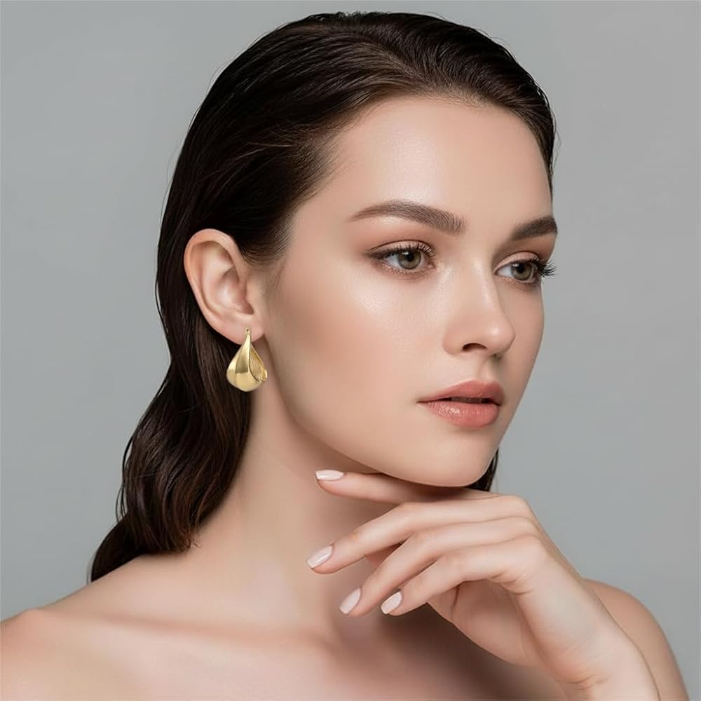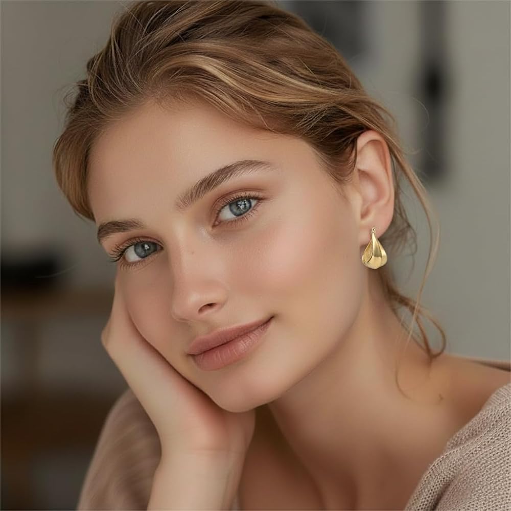 [FACE-FLATTERING WATERDROP SHAPE] Expertly crafted to flatter, these 25mm gold hoop earrings feature a subtle waterdrop silhouette that is narrower at the top and wider at the bottom. This elegant shape of the 14k gold plated earrings for women helps to softly frame the face, elongate the jawline, and enhance your natural features, making them ideal everyday earrings for women.