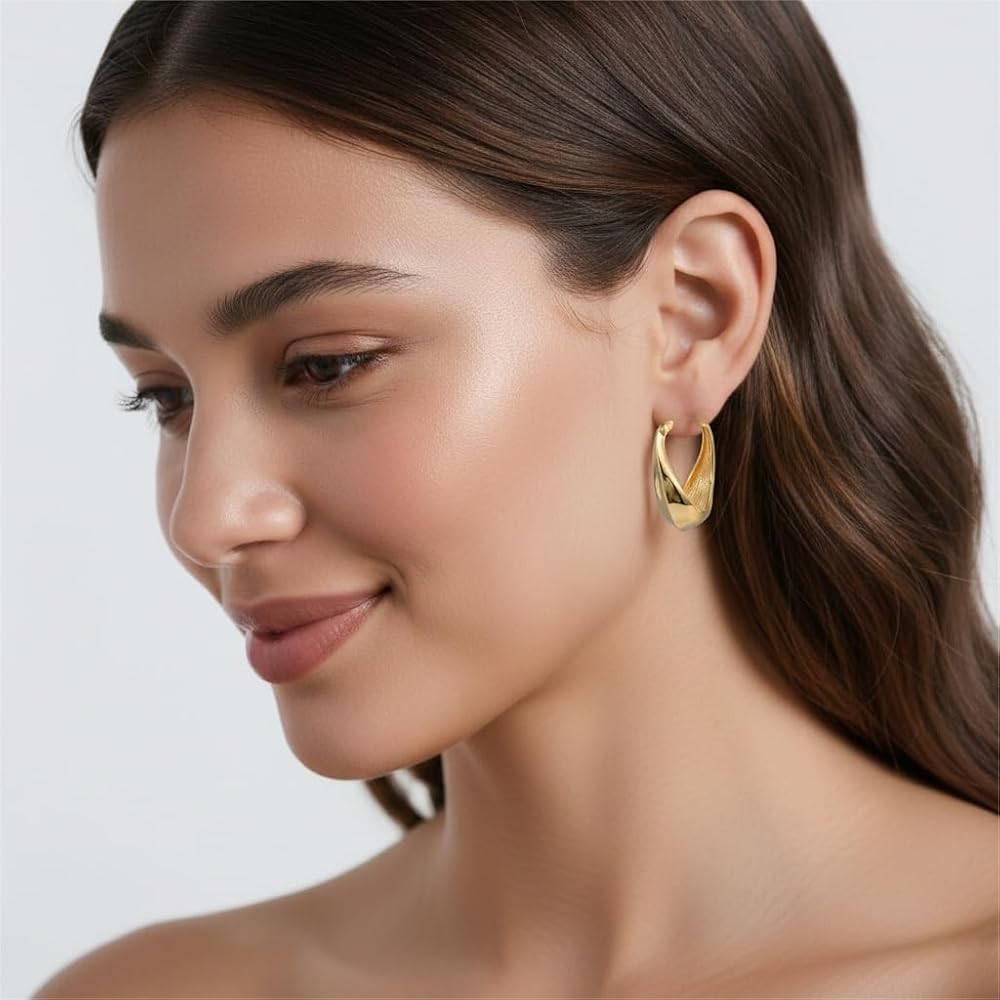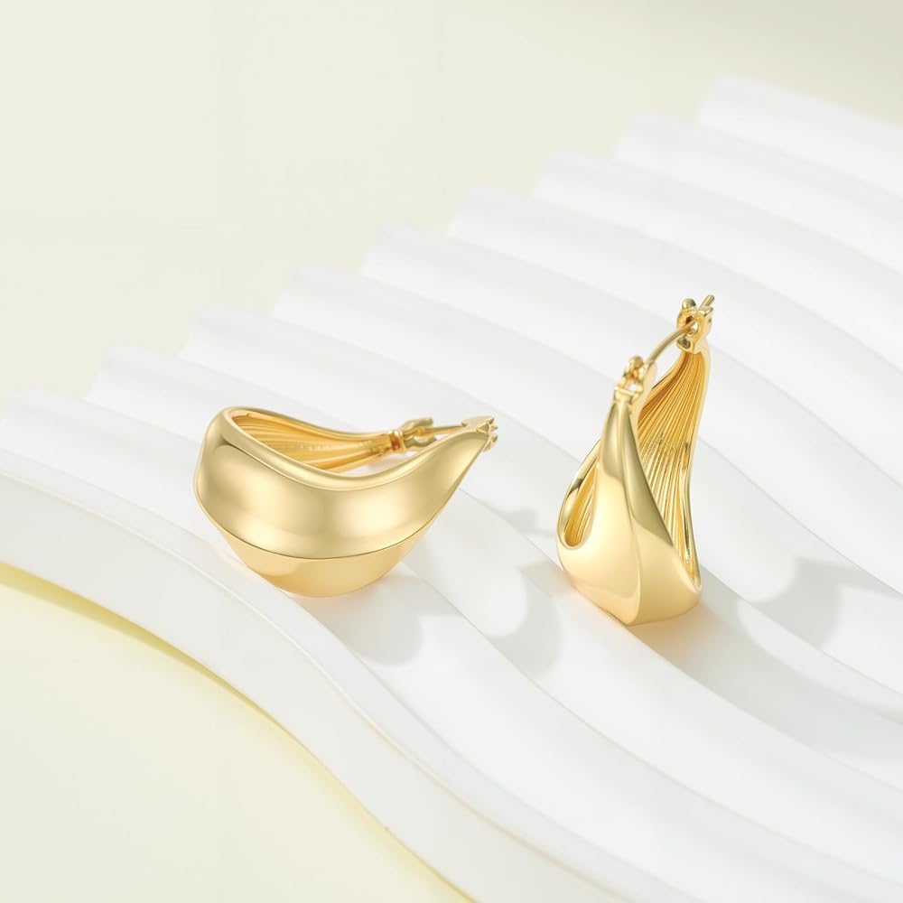 [QUALITY YOU CAN TRUST] Crafted from high-quality materials and plated with durable 14K gold, these hypoallergenic hoop earrings for women are built to last. They are resistant to tarnishing, fading, and warping, ensuring that these elegant earrings for women retain their beautiful luster and unique shape wear after wear.
