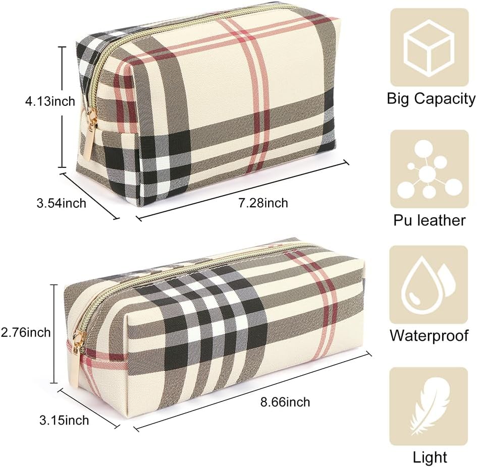 MAANGE Small Makeup Bag for Purse, 2 PCS Cosmetic Bag for Women Travel Makeup Pouch Leather Make up Bag Portable Zipper Pouch Brushes Bag - khaki plaid