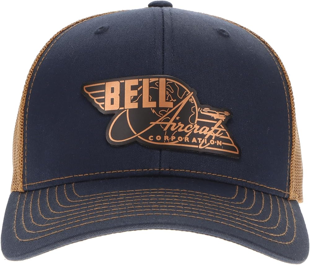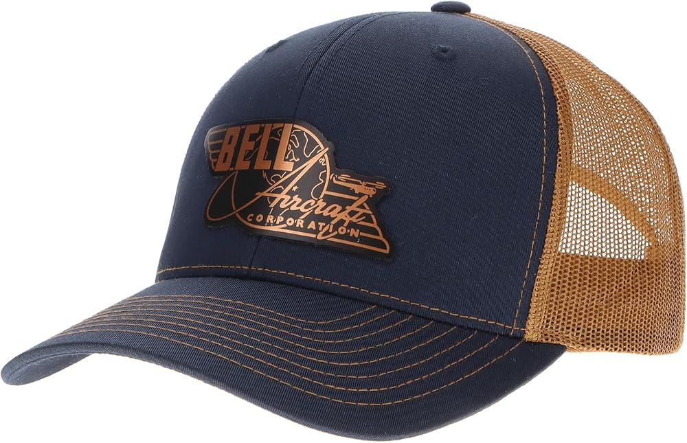 Celebrate aviation heritage with the Bell Classic Logo Heritage Trucker Hat from Aeroplane Apparel Company, featuring a striking classic Bell logo patch engraved in reflective chrome on black leatherette for a modern-meets-retro look. Built on an iconic six-panel, mid-profile trucker cap, it pairs a durable cotton-poly twill front with a breathable mesh back for all-day comfort, while the pre-curved bill, standard cotton sweatband, and adjustable snapback deliver a familiar, customizable fit for any head size. Bell emblems, logos, and body designs are trademarks of Textron Innovations Inc. and are used under license by PilotMall.com Inc.
