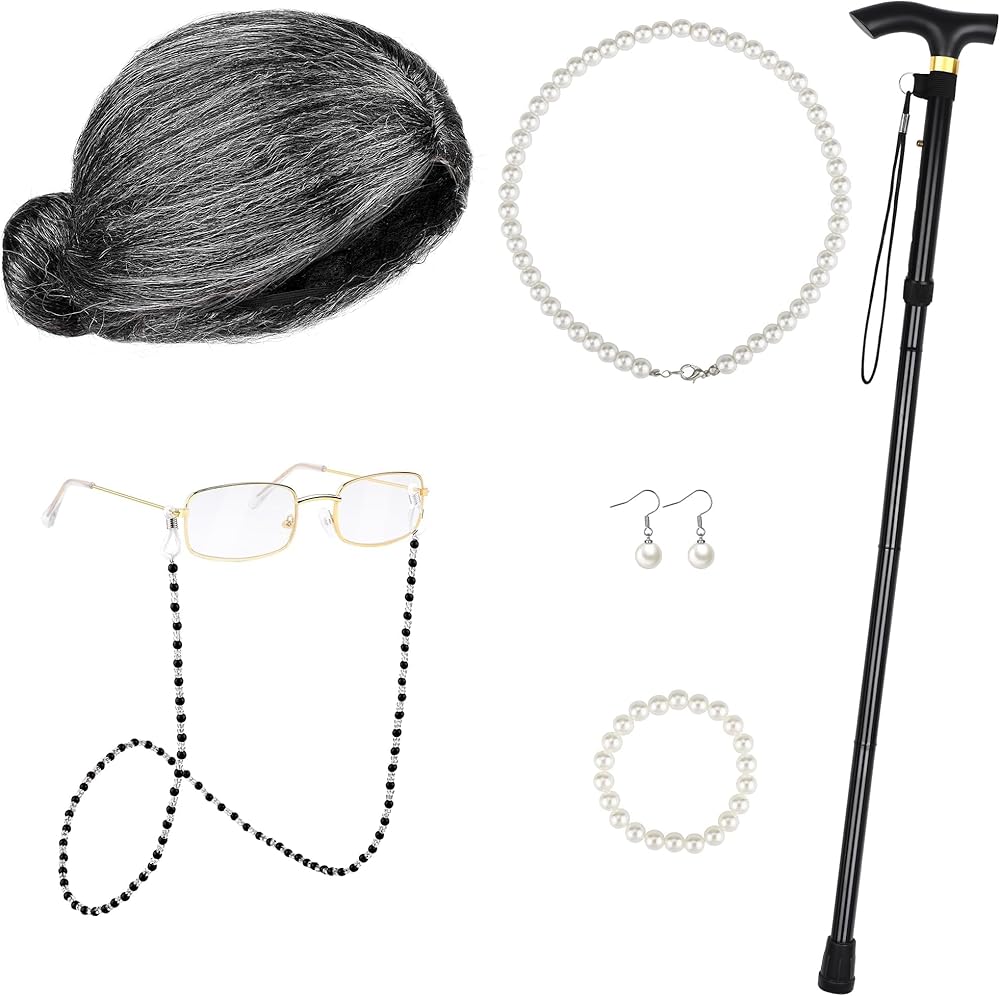 Complete 9-Piece Set: includes 1 gray old lady wig, 1 wig cap, 1 pair of grandma glasses, 1 eyeglass chain, 1 foldable metal cane, 1 faux pearl necklace, 1 faux pearl bracelet, and 2 pearl earrings—ideal for 100 Days of School celebrations and themed parties