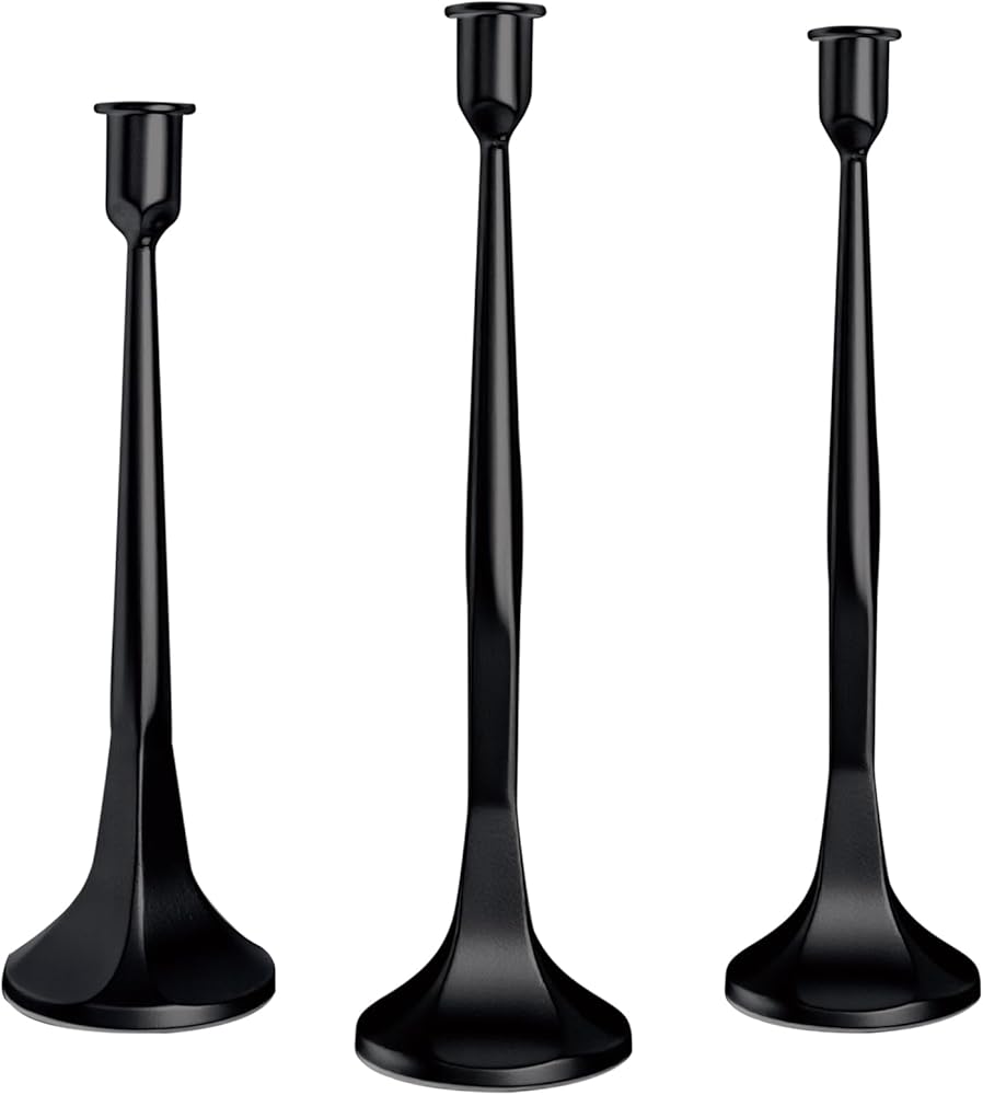 Bring timeless elegance and sculptural character to your space with this Antique Iron Taper Candle Holder Set of 3(12" 14" 15.5")(Gold/Black), designed to serve as both functional candle stands and refined decorative accents. Featuring a clean vertical profile and a classic antique-inspired finish, these candlestick holders strike a balance between traditional craftsmanship and modern minimalism. Each candle holder is crafted from solid iron, offering a substantial weight and stable base that ensures secure placement on dining tables, mantels, shelves, and countertops. The sturdy metal construction not only enhances durability but also adds visual depth and texture, making these candle holders feel like true statement pieces rather than lightweight décor. Designed to fit standard taper candles, the holders keep candles upright and steady, helping you create an elegant candlelight arrangement without distraction. Whether used for intimate dinners, relaxed evenings at home, or festive celebrations, the soft glow of taper candles paired with these metal stands instantly enhances the atmosphere of any room. This set of decorative candlestick holders adapts effortlessly to a wide range of interior styles, including farmhouse, industrial, vintage, modern, and minimalist décor. Arrange all three together to form a striking table centerpiece, or place them separately throughout your home for a cohesive design theme. Ideal for weddings, dinner parties, holidays, and seasonal décor, these taper candle holders also make a thoughtful gift for housewarmings, anniversaries, and special occasions. Available in Black and Gold color options, they allow you to choose the perfect finish to complement your existing décor or event theme. Whether styled for everyday elegance or reserved for memorable gatherings, this metal taper candle holder set adds warmth, balance, and timeless appeal to any living space.
