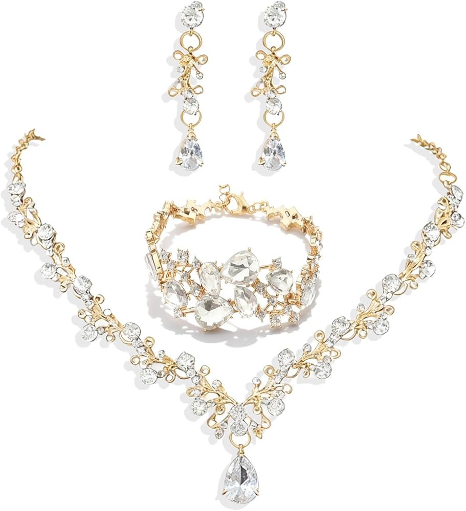 Make your wedding day unforgettable with this exquisite wedding jewelry set. Designed with stunning green crystal rhinestones, this set includes a bracelet, necklace, and earrings, each adorned with sparkling zircon crystals that catch the light from every angle. The elegant design of this set makes it perfect not only for brides but also for wedding guests or anyone attending a special event. The vibrant green crystals paired with the gold accents create a sophisticated yet striking contrast that will complement a variety of dresses, from classic white bridal gowns to elegant olive green wedding guest dresses. This jewelry set is the perfect balance of dainty and dramatic, offering just the right amount of sparkle to elevate any outfit. It also makes an excellent gift for weddings, New Year's Eve parties, or any occasion where you want to give someone a beautiful, timeless piece of jewelry. Whether you re dressing for a wedding, a formal dinner, or a night out, this sparkling jewelry set adds a refined and glamorous touch to your look. It s the ideal accessory to make your occasion truly special.