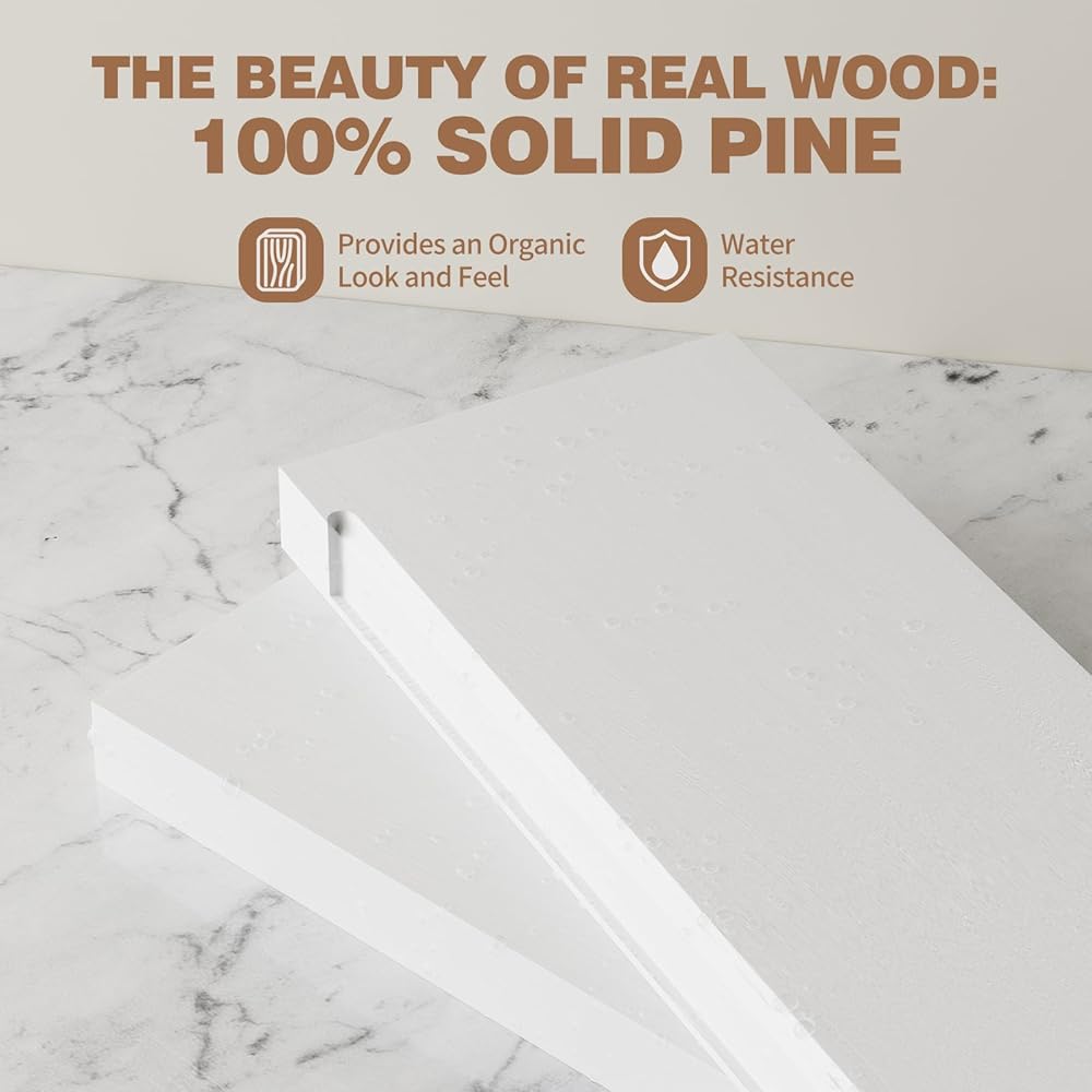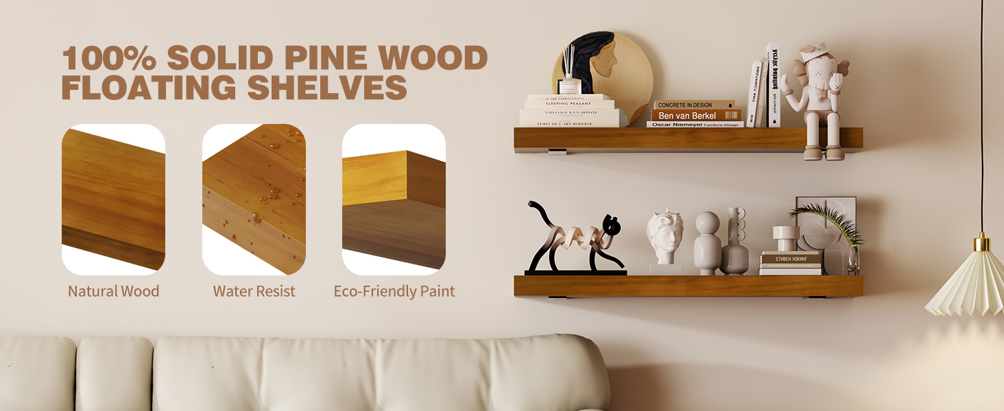 Solid Pine Wood: This floating shelf is handcrafted from natural pine and finished with water-resistant paint, revealing subtle color variations as the light changes. It celebrates the inherent beauty and strength of solid wood, which helps protect against moisture