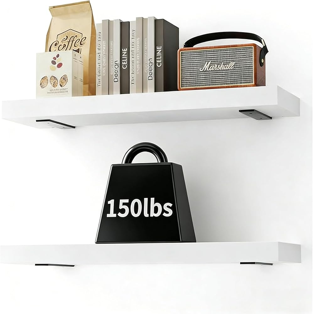 yaqew Solid Wood Floating Shelves 24'' Long, 8'' Deep Wall Mounted Shelves with Heavy Duty Brackets, Max Load 150 lbs, Wall Shelves for Bathroom Kitchen Living Room, 24 x 8 x 1.6 in, White, Set of 2