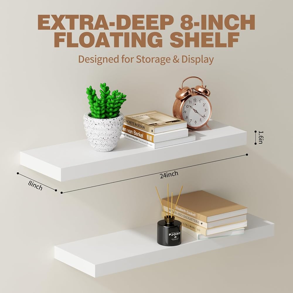 Deeper & Thicker: With a generous 8" depth and a solid 1.6"-thick panel, this 24" wall shelf offers ample space for books, photos, plants, and more. Its sturdy build is perfect for any room—living room, kitchen, bedroom, bathroom, office, or laundry room