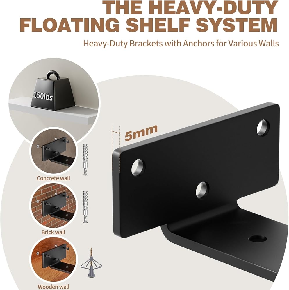 Holds Up to 150 lbs: These heavy-duty brackets are made from 5mm carbon steel with a one-piece stamping process for weld-free strength and superior toughness. They support up to 150 lbs when used with the included versatile wall anchors and screws. The countersunk holes create a flush, clean look, and detailed instructions are provided