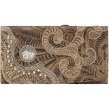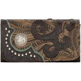 This premium leather wallet from the American West Annie's Secret Collection has a gorgeous western look all its own. It features a beautiful, hand tooled design with leather overlays, plus concho and stud accents. The genuine leather interior has plenty of storage for your cards and cash, and there's even a zippered exterior pocket for coins. Pair with matching bags from Annie's Secret Collection to complete the look.