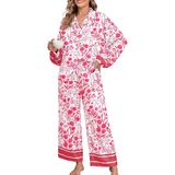 Long Sleeve Pajama Set for Women Featured: Womens button down pajama sets, featuring a lantern sleeve button down shirt and matching wide leg pajama pants for women, showcase a loose fit that seamlessly merges lazy loungewear vibes with fashionable styling. This silk pj set boasts a roomy silhouette with an elastic waistband, naturally flattering all body types