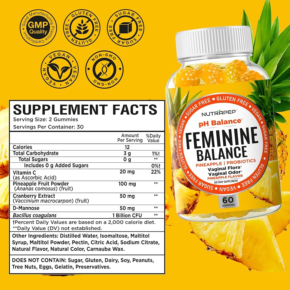 Convenient, Tasty, and Pineapple-Flavored: Take the hassle out of maintaining your feminine health with NutraPep Nutrition Feminine Balance Gummies. With just two gummies a day, you can enjoy a delicious pineapple-flavored gummy supplement that fits effortlessly into your daily routine. Perfect for busy women, these Women's Vaginal Probiotic Gummies offer a simple and enjoyable way to nourish your body and support your feminine health with every bite.