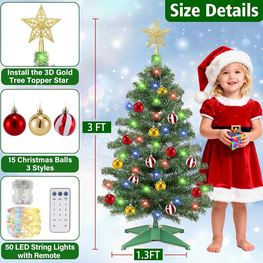 [ Remote Control & 12 Modes ] 3 Ft Christmas Tree with Timer 50 Warm White & Multi Color Lights, 15 DIY Ornaments 3D Star Topper - Artificial Small Green Christmas Tree for Home Indoor Tables - Green