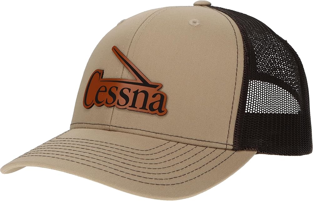 Celebrate mid-century aviation style with the Cessna 50's & 60's Logo Heritage Trucker Hat from Aeroplane Apparel Company, featuring a crisp black-engraved patch of the iconic period Cessna logo on a rich buckskin-colored leatherette for a vintage look; built on the classic six-panel, mid-profile trucker silhouette, it pairs a durable cotton-poly twill front with a breathable mesh back for all-day comfort, and includes a pre-curved bill, standard cotton sweatband, and adjustable snapback for a familiar, versatile fit inspired by the era of legendary aircraft like the 172 and 310.
