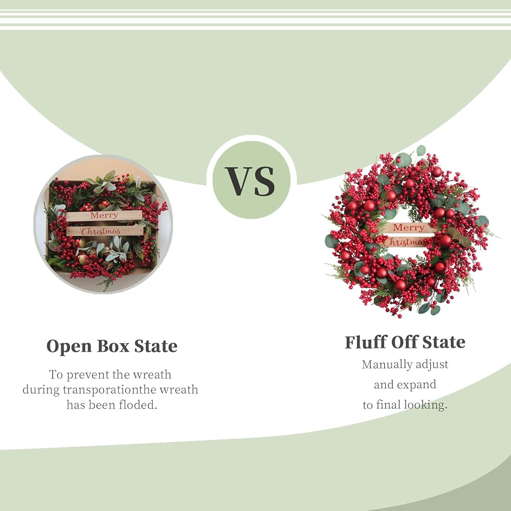 Perfect Size:The diameter of this Christmas wreath is 24 inches. Because brands are compressed by the box during transportation to avoid damage, the wreath will be packed in a sturdy and exquisite box. Please refer to our instructions before hang it ,arrange the position of the berries and leaves for a satisfactory shape