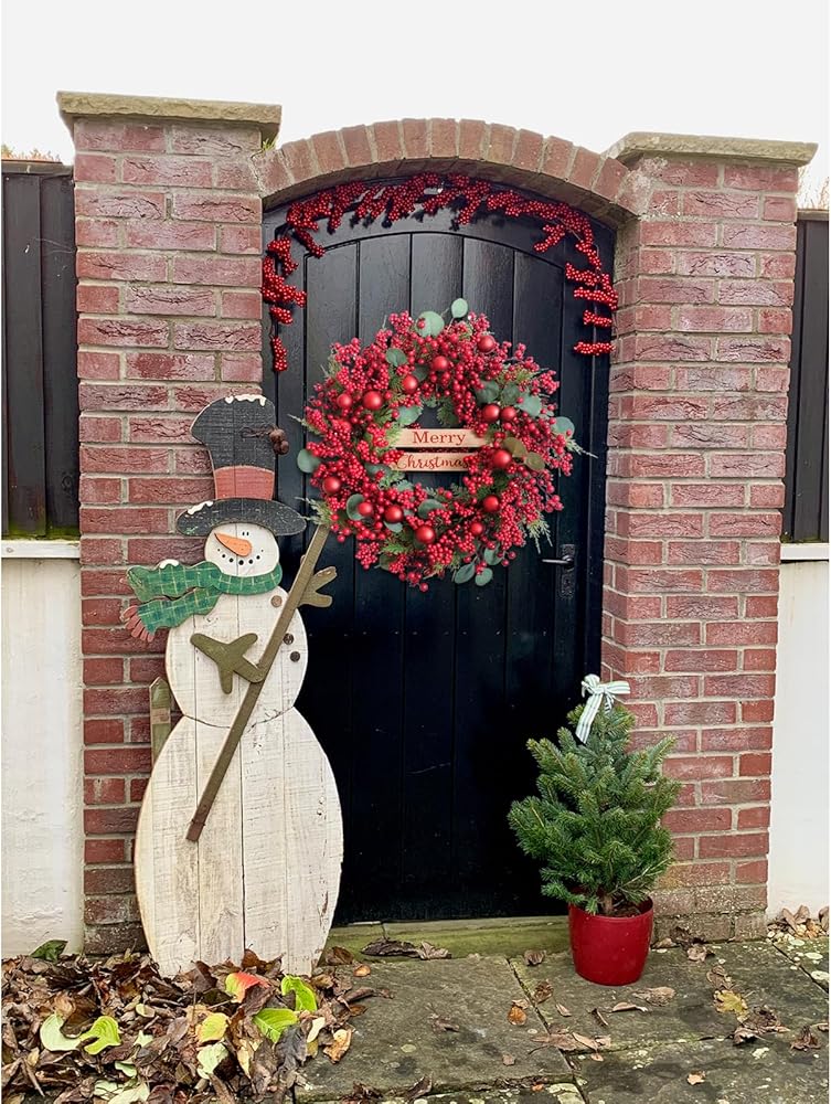 Merry Christmas:This Christmas wreaths Using Thick and sturdy hand-woven vines as the base , decorated with festival elements such as simulated little red berry clusters,big red berry,green eucalyptus leaves and cacumen biotae, every detail showcases extraordinary taste.Filling every corner with festival atmosphere